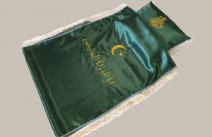 Изготовлен из гладкого атласа зеленого цвета Покрывало 210×75 см. Подушка 40×50 см На комплекте вышита мусульманская символика