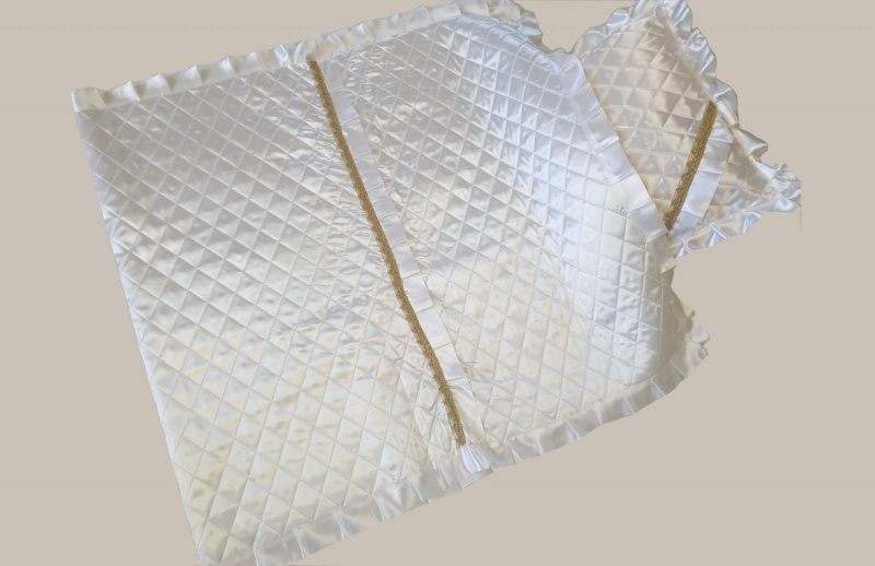 Изготовлен из стеганного атласа Покрывало 200×90 см. Подушка 40×50 см Покрывало и подушка декорированы атласной лентой.